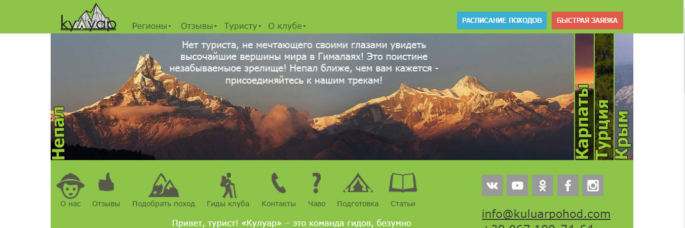 Ми створили сайт клубу туристів "Кулуар". Сайт являє собою систематизований каталог походів і турів. Тур можна підібрати по регіону, складності, типу і часу. Реалізована сортування по ціні і дату старту. Проект розрахований на сотні походів і десятки інструкторів. Для новачків на сайті є багато матеріалів і статей про походи і про підбір спорядження. Відвідування та інструкторів можна оцінити, написавши відгук....