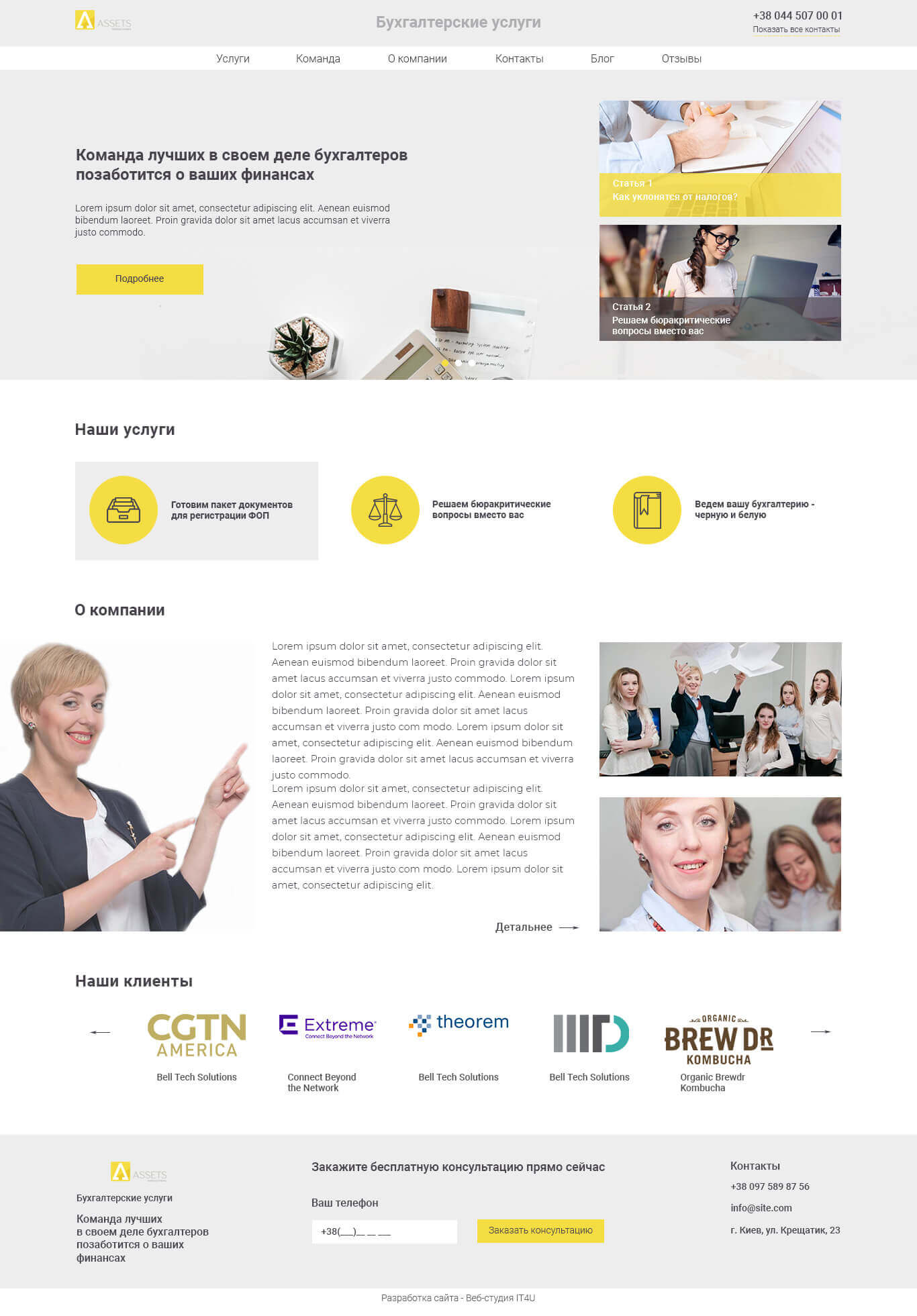 Тому безпосередньо на головній сторінці ми зробили висновок ключових статей з блогу, показали список послуг, команду і ключових клієнтів.