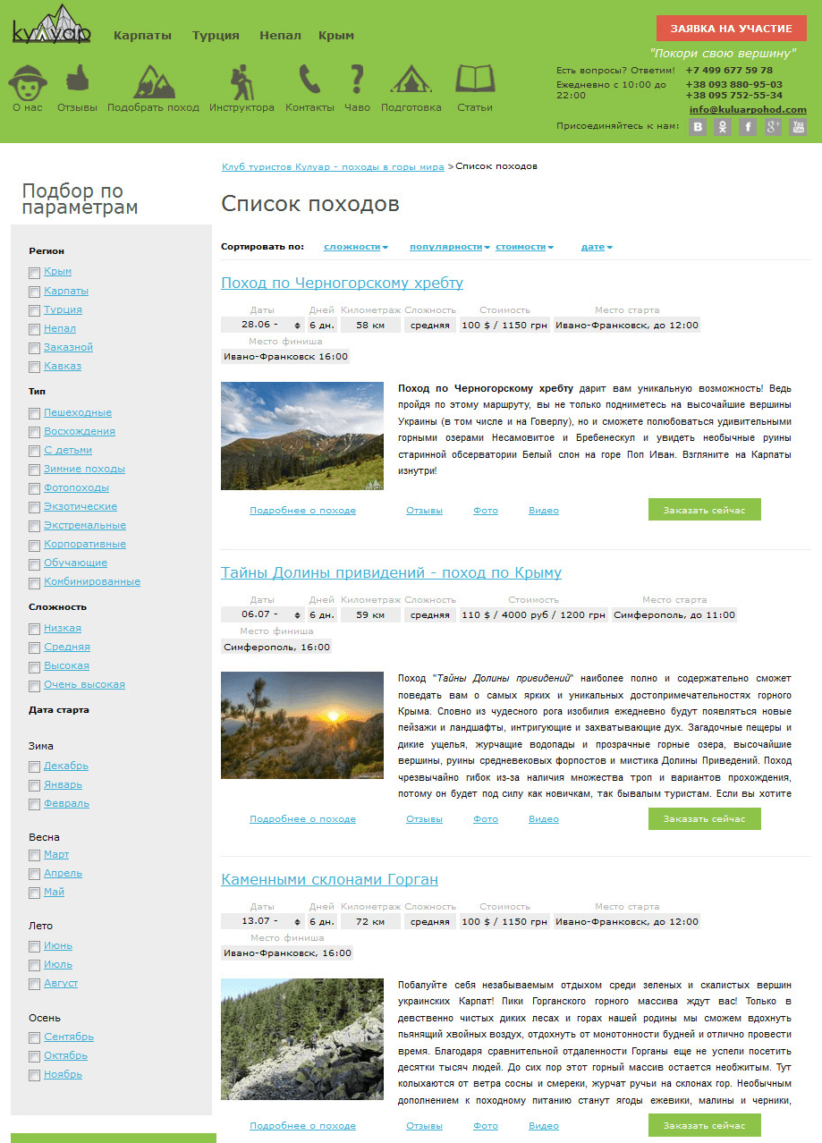 На сайті реалізований зручний підбір походу, в залежності від уподобань і можливостей бажає піти в похід (регіон, тип, складність, дата старту). Також реалізована сортування, яка відбирає походи по складності, популярності, вартість і дату. В результаті виводиться список походів з короткою інформацією про них і можливістю замовити похід вже на цьому етапі.