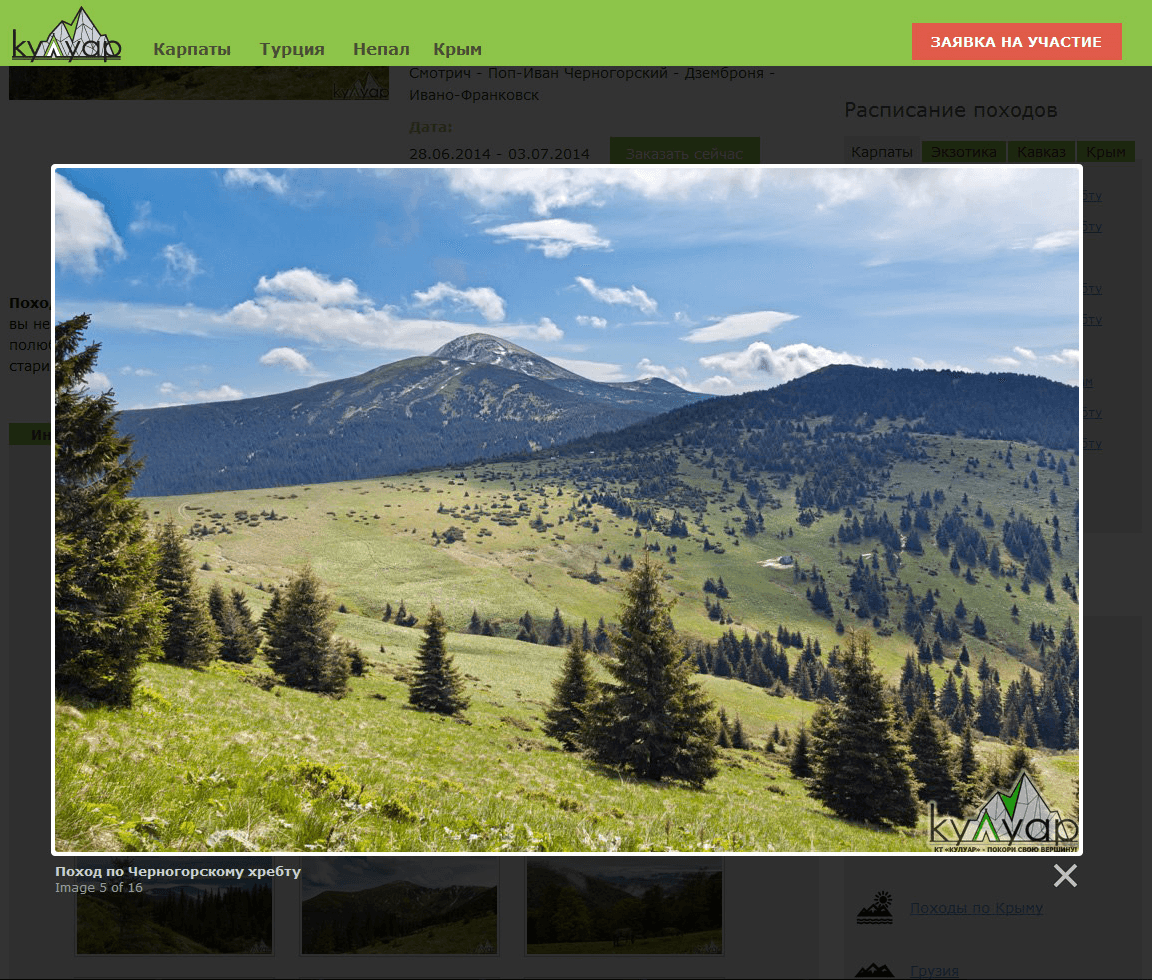Якщо ж відвідувач бажає ознайомитися більш детально з інформацією про похід, він може перейти по посиланню, і потрапити на сторінку з повним описом. Тут міститься повна інформація включає опис, підготовку, фото і відео, а також відгуки про похід.
