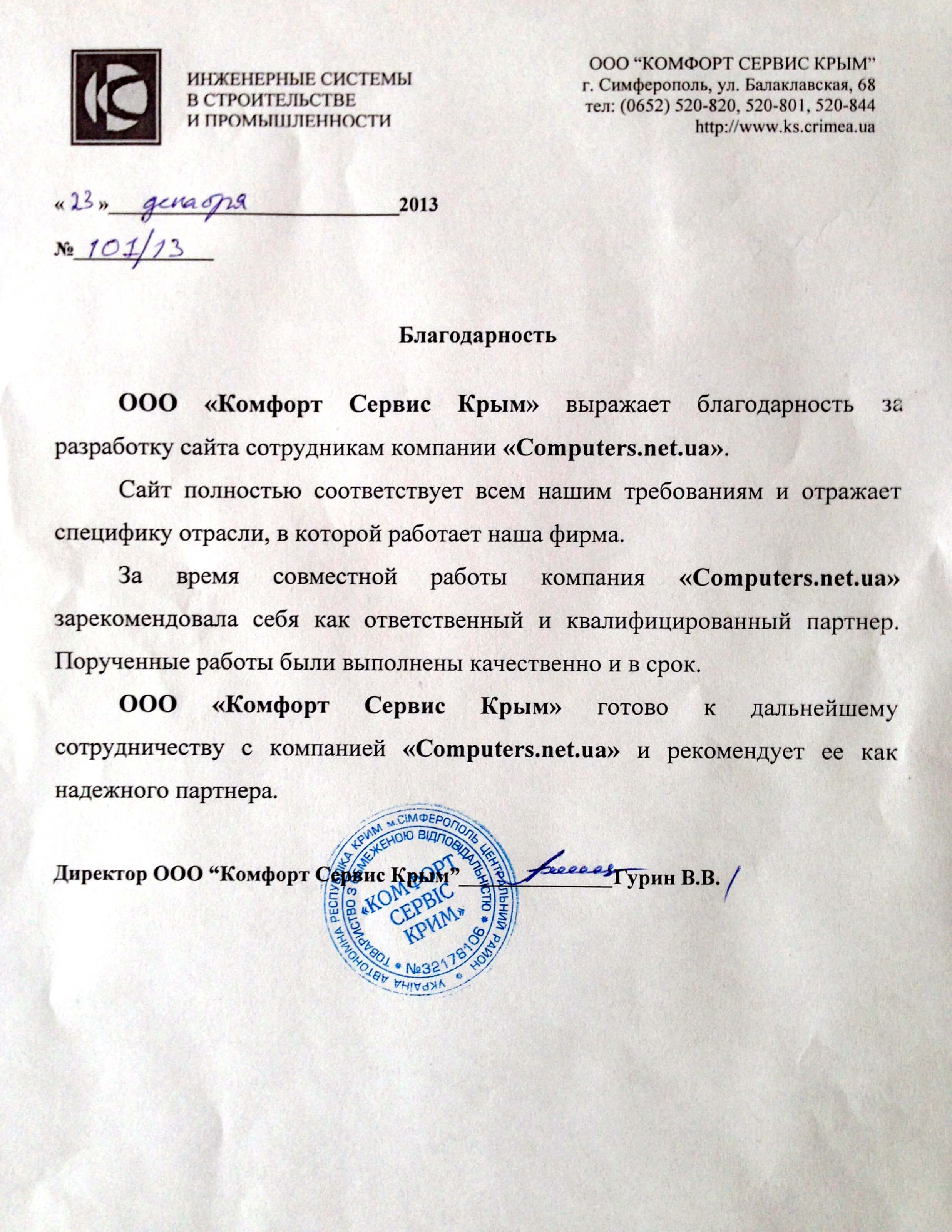 Директор ООО “Комфорт Сервис КрымООО «Комфорт Сервис Крым» выражает благодарность за разработку сайта сотрудникам компании «Сomputers.net.ua».