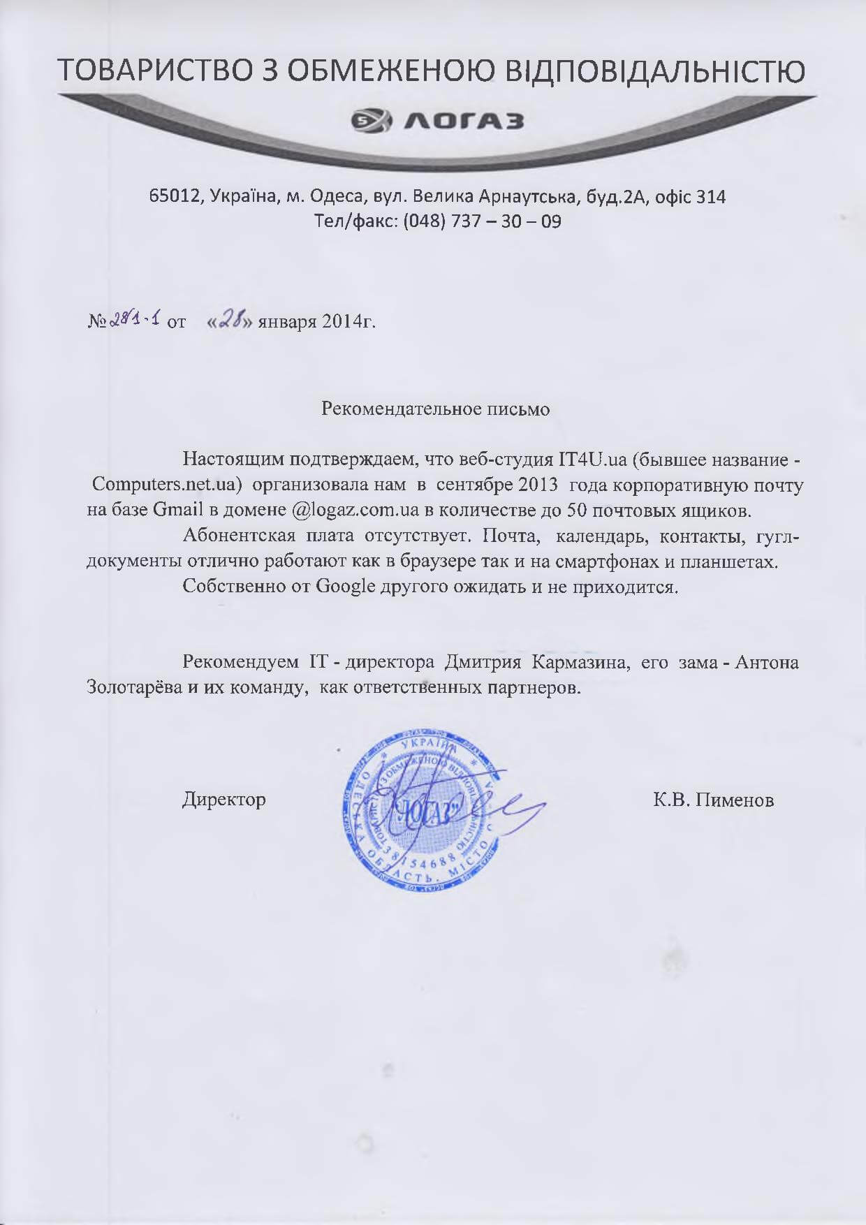 ДиректорНастоящим подтверждаем, что веб-студия IT4U (бывшее название — Computers.net.ua) организовала нам в сентябре 2013 года корпоративную почту на базе Gmail в домене @logaz.com.ua в количестве до 50 почтовых ящиков. Абонентская плата отсутствует. Почта, календарь, контакты, гугл-документы отлично работают как в браузере так и на смартфонах и планшетах. Собственно от Google другого ожидать и не приходится.